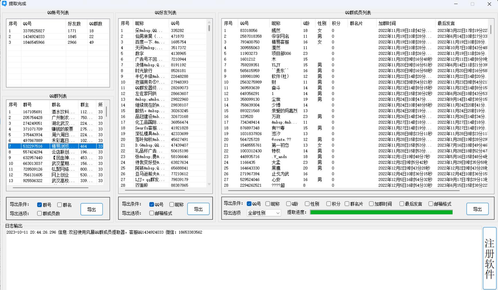 软件可以自动提取QQ群成员数据,一键导出,支持发言时间,性别,Q龄字段的筛选。